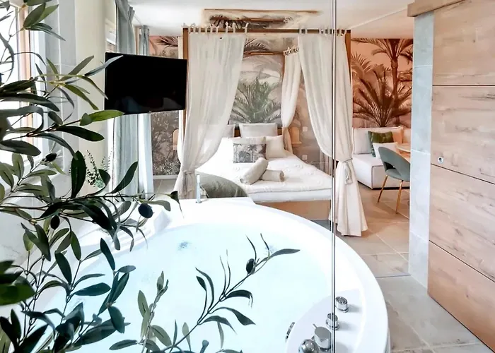 トルヴィル=シュル=メ-ルでの休暇を楽しむには,サント-ギュスタン教会からたった1.7kmで,Savignac galerieから歩いて6分の寝室1室のJardin D'Eden : Sauna, Balneo & Jardin Privatif トルヴィル=シュル=メ-ルアパ-トがあります.